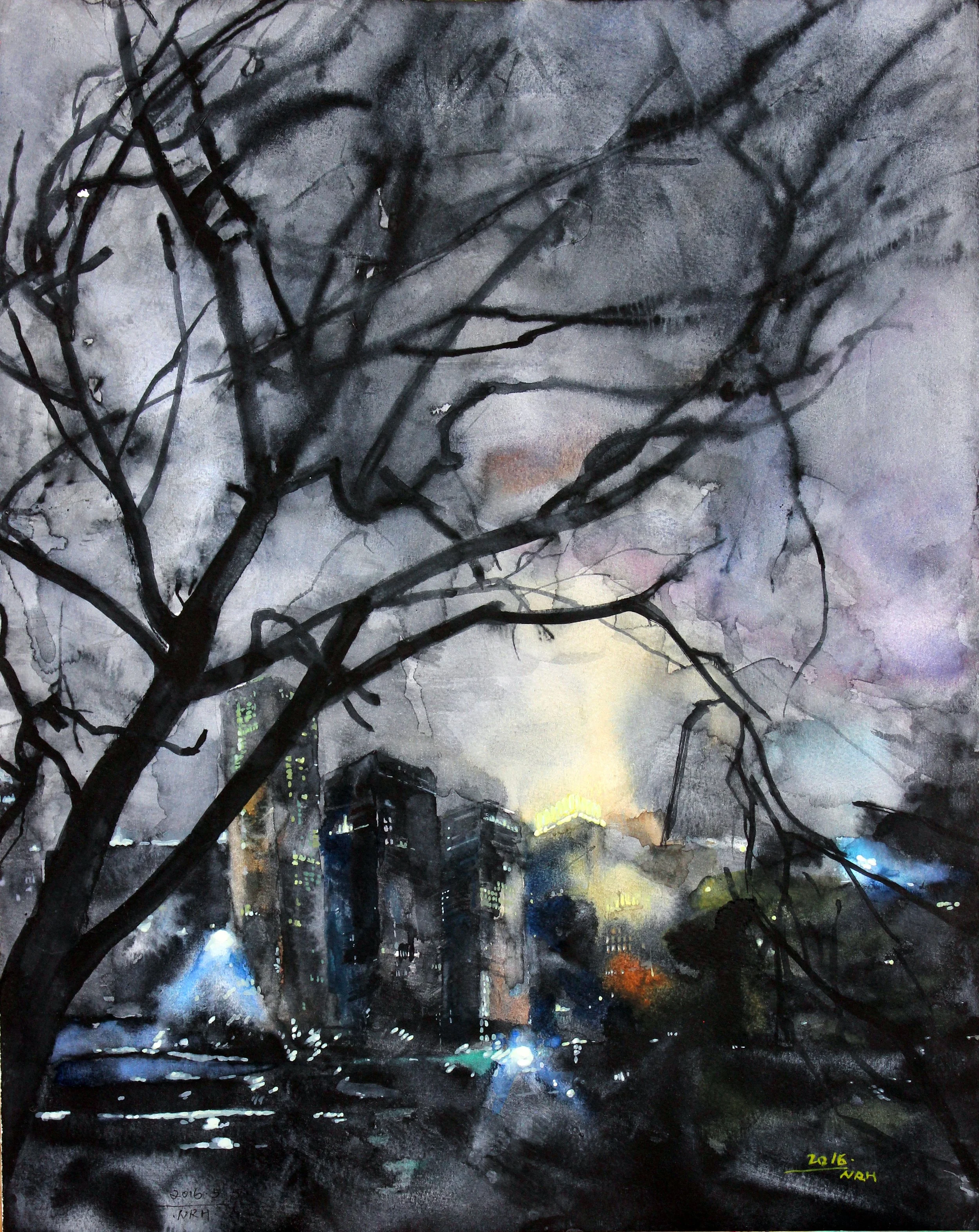 This was my first visit to Manhattan. On a rainy New Year’s night, walking from Central Park toward Fifth Avenue, I was captivated by the symphony of light and shadow. Backlit through intricate black tree silhouettes, the streetlights and building illuminations formed a dazzling spectacle. The wet atmosphere and reflective surfaces added depth and layers to the scene. The expressive qualities of watercolor bring drama and fluidity to the cityscape.